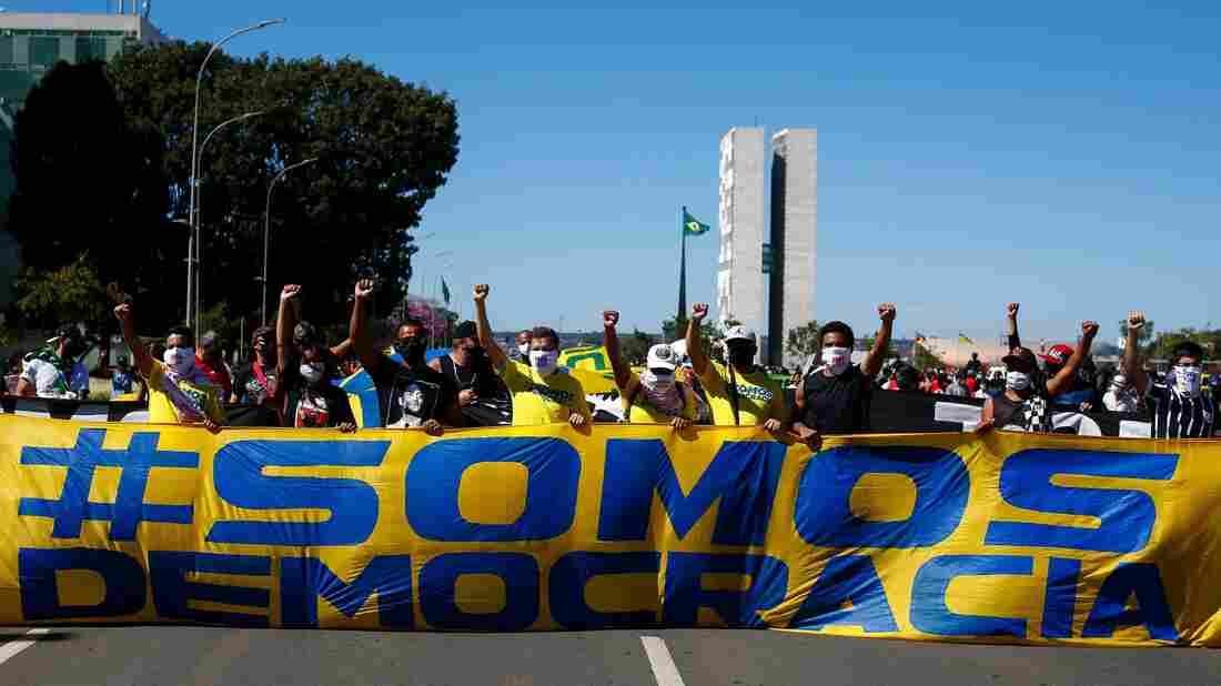 Demonstrators hold a banner that says "We are democracy" during a protest against Brazilian President Jair Bolsonaro and racism in Brasilia, Brazil, on June 21. Sergio Lima/AFP via Getty Images hide caption