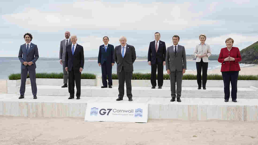 Leaders of the Group of Seven countries pose for a photo by the beach in Carbis Bay, in Cornwall, England, on June 11. Patrick Semansky/AP
